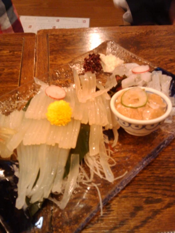 前回は食べれなかった活イカを悪魔3+1+すみれで堪能。うまかった。一杯2,380円と高価ですがボリュームもあり納得の逸品。キモがうまかった。臭みなく濃厚とろとろ。